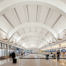 The curved plank system enabled a variety of arch lengths to be utilized in shaping the semi-cylindrical ceiling design. Planks with smaller radii were installed in the concourse area, while those with larger radii were used in the other public spaces, including the 70-foot-high vault in the baggage claim area.