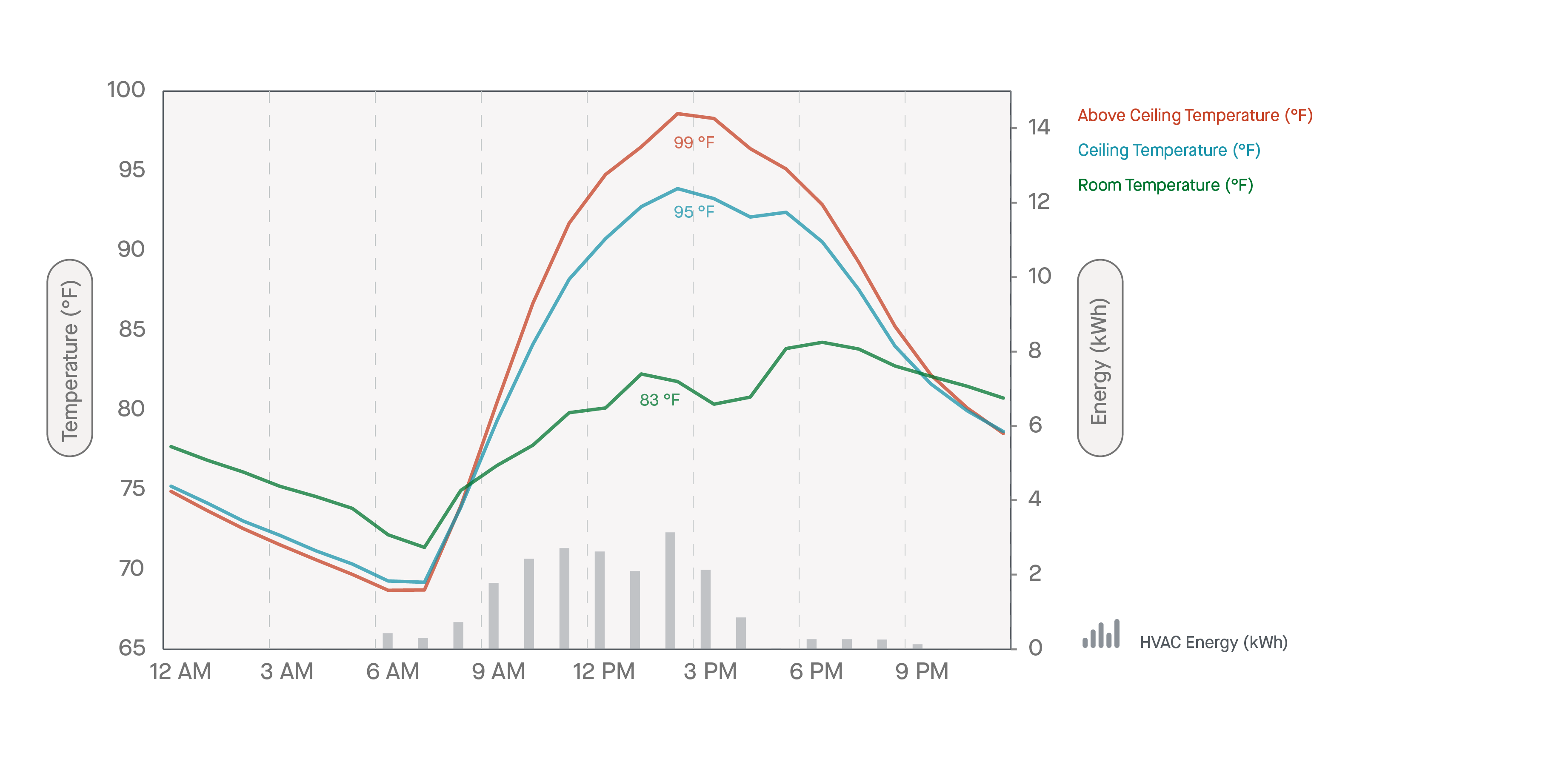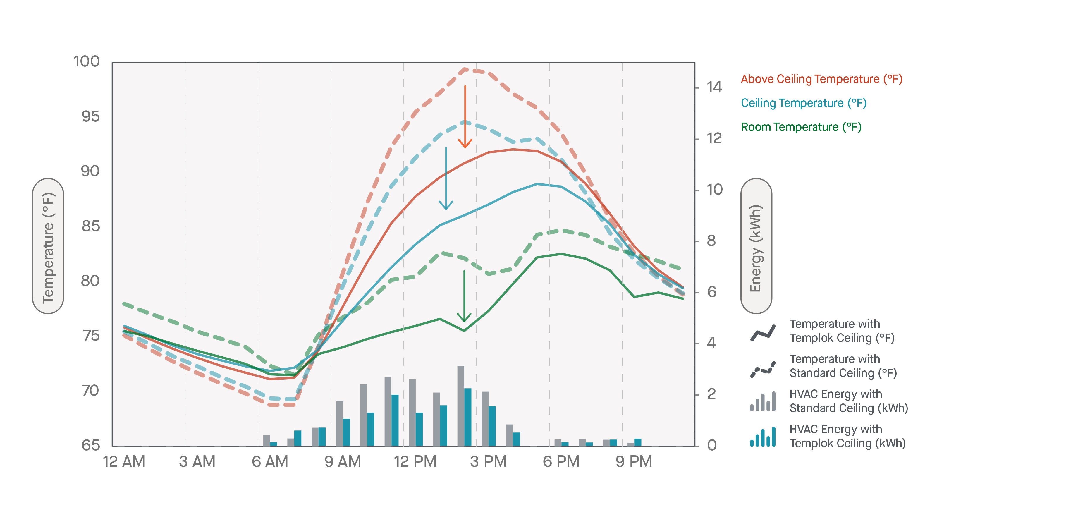 Afternoon HVAC Demand Shaved: The most significant energy reduction also occurred during the hottest afternoon hours (12 PM – 3 PM), when solar gain is highest. The TEMPLOK ceilings shaved HVAC energy demand by up to 20% during these hours, according to a multivariate analysis of the entire study period.