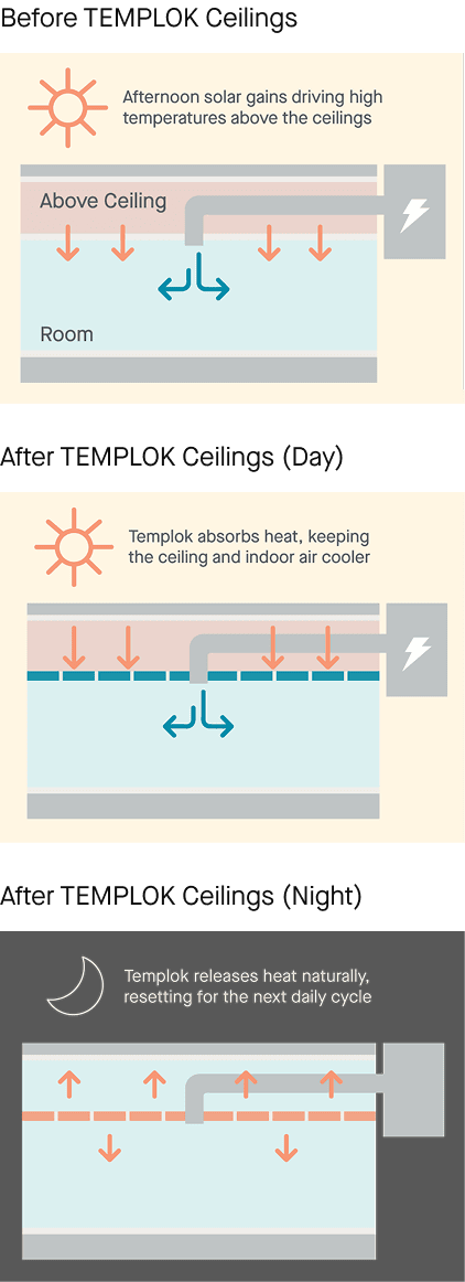 To take advantage of the large day-night temperature swings of the desert climate, TEMPLOK ceiling tiles containing Phase Change Material (PCM) were installed to add thermal mass inside the buildings. Positioned between the hot roof and the occupied space, the TEMPLOK ceiling acts as a thermal buffer, absorbing heat from above rather than passing it through the ceiling. The PCM inside the ceiling melts as temperatures rise throughout the day, and naturally refreezes overnight as temperatures fall, resetting for the next daily cycle.