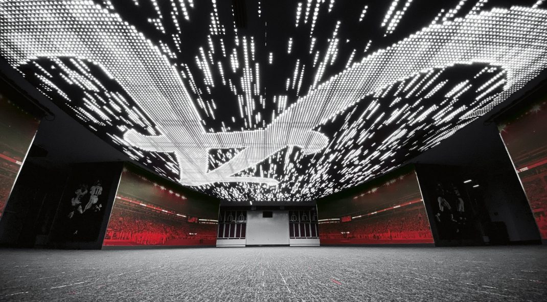 “We wanted the locker room to be a little bit darker, a little bit more subdued,” says Ranly, “creating an intimate atmosphere and mood.” To achieve that, the design team opted for a 360-degree panoramic photo of a game day stadium for the walls and began exploring ways the ceiling could be used to add impact to the space. “We didn’t want a standard illuminated Alabama Script A logo in the ceiling,” explains Ranly. “We wanted to do something that hadn’t been done before, leaving a memorable experience and strong visual impression.”