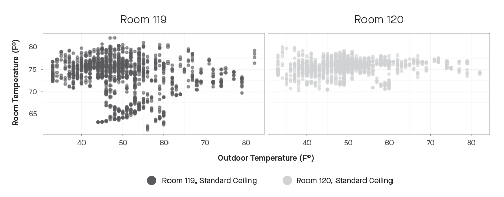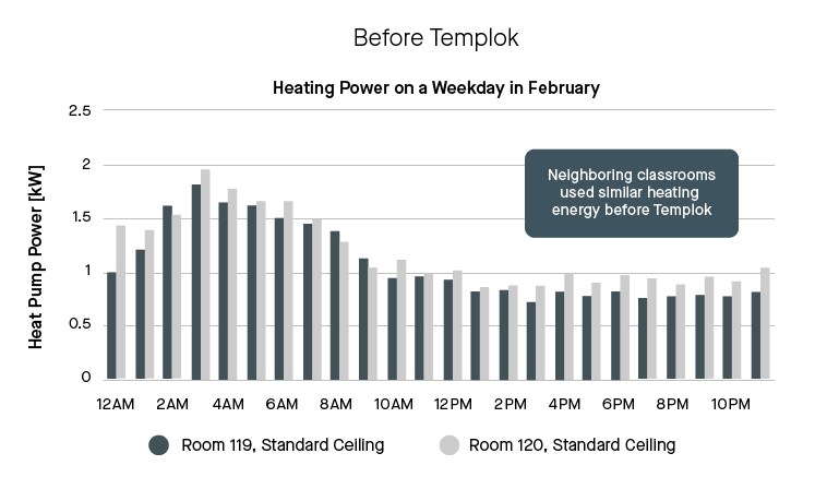 A set of neighboring classrooms were monitored for heating energy use in the month of February. Daily energy use was strongly correlated between the classrooms. On March 1, TEMPLOK ceilings were installed in Room 120, and Room 119 was left alone for comparison.