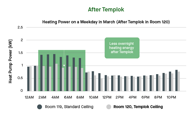 Several months of data were analyzed before and after the TEMPLOK ceiling installation. After controlling for variables like outdoor air temperature, estimates ranged from 5 to 9% heating energy savings from Templok ceilings. (Fig 3)