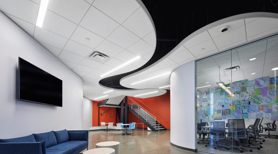 Colder Products Company’s (CPC) new global headquarters needed the ceiling design to be more than just a centerpiece to convey its forward-thinking culture to staff, clients, and visitors. The company charged Hagen, Christensen, & McIlwain Architects with developing a ceiling that inspired movement and established connectivity across every space—from offices to breakrooms—on not one, but two stories. The Mississippi River drove the vision as a symbol of the state, a point of pride for the local community, and a means to create flow through the entire building.