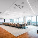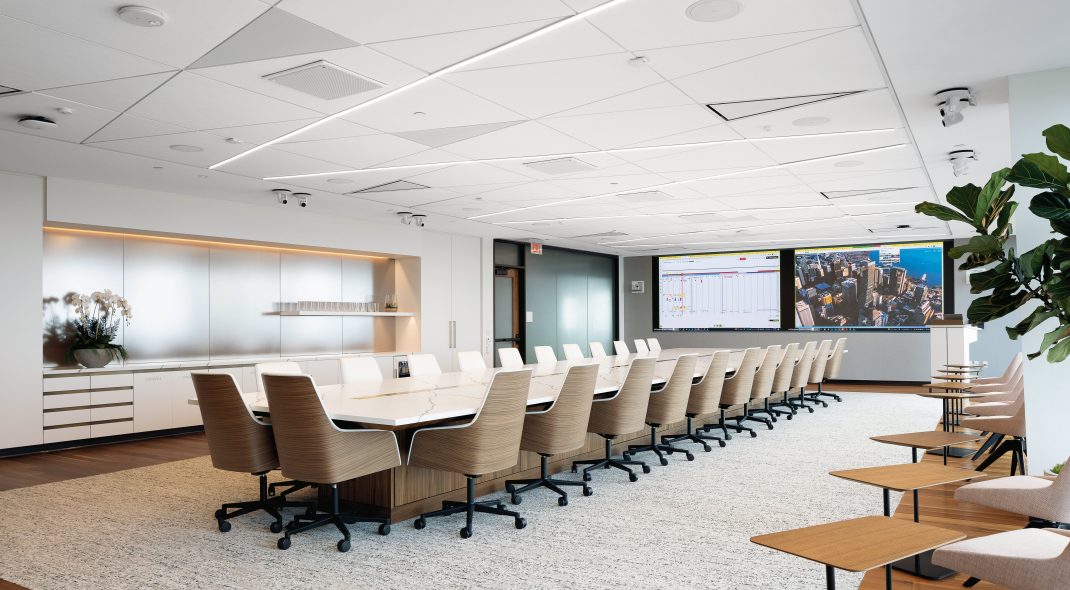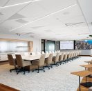 Ultimately, seven integrated ceiling solutions were installed in the boardroom. They included LYRA PB Shapes for DESIGNFLEX, ACOUSTIBUILT Ceiling Panels, FRAMEALL Drywall Grid, and AXIOM Shade Pockets and Transition Molding, all from Armstrong as well as Price® Shaped Diffusers and Vode® ZipTwo® Lighting.