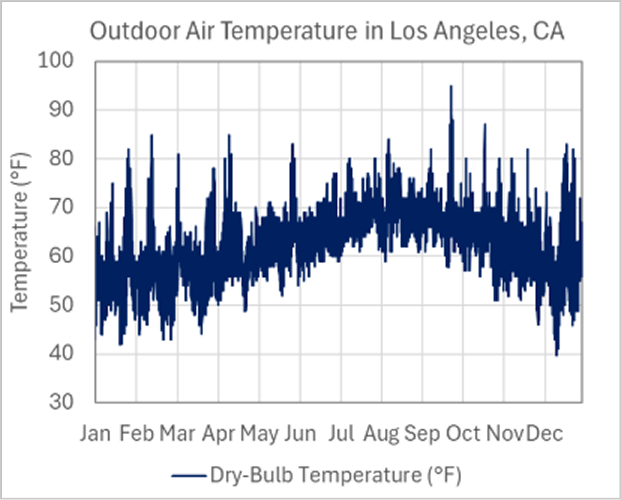 Fig 1: Typical dry-bulb temperatures in Los Angeles, CA, showing many cool nights below ~70°F that allow the PCM to naturally freeze.