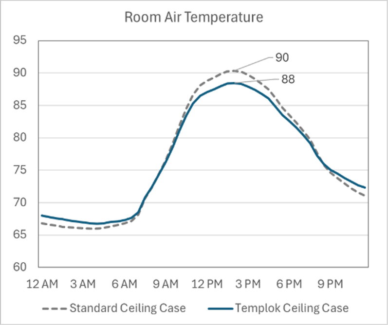 The thermal mass of TEMPLOK also enhances building resilience and passive survivability during power or HVAC outages. In a simulated summer outage scenario, spaces with TEMPLOK ceilings remained approximately 2 °F cooler than those with standard ceilings, consistent with results from controlled test-room experiments and classroom field studies conducted in Southern California (Fig 11).