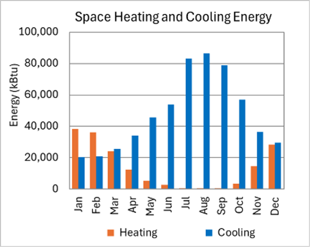 Fig 2: Monthly space heating and cooling energy in a prototypical office model, illustrating that most months require some heating and cooling that can be buffered down.