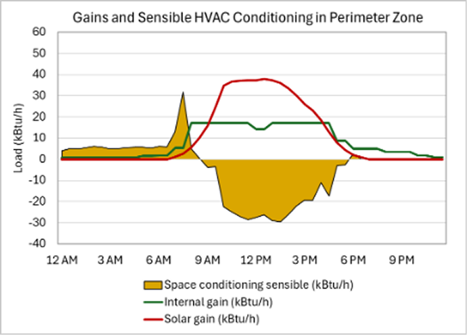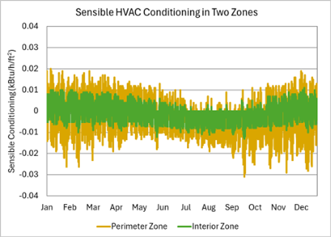 Fig 3: Sensible heating (positive) and cooling (negative) energy in perimeter vs. interior zones, showing larger daily swings in perimeter areas.