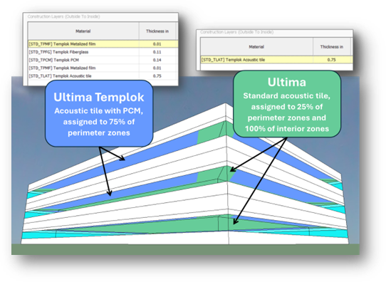 ULTIMA TEMPLOK ceilings were applied to 75% of the perimeter-zone ceiling areas. The remaining 25% were modeled as standard ULTIMA tiles that can be cut around room edges and MEP fixtures. Overall, TEMPLOK panels covered 31% of the building’s conditioned area (Fig 5).
