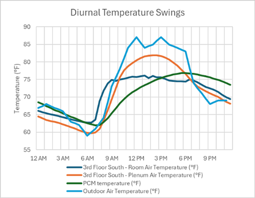 Room-level results for a typical fall day show the PCM cycled between 62 °F and 78 °F, a wide range that exercised most of the PCM’s latent-heat storage capacity. The temperature difference between the PCM and the air indicates the PCM provided warmth in the early morning and cooling in the afternoon through passive heat exchange (Fig 6).