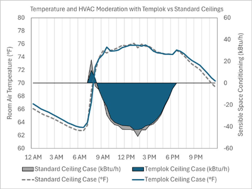 Analyzing the heating and cooling patterns between the TEMPLOK and standard ceiling simulations shows that TEMPLOK reduced morning warm-up and afternoon cooling demand while moderating overall room temperature variation (Fig 7).