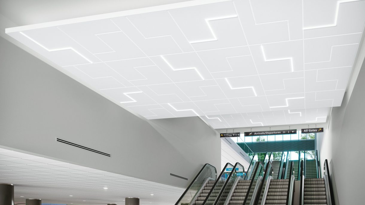 In addition, JLC Tech T-BAR STAX™ lights—specifically designed for the DESIGNSTACKZ Ceiling System—elevate the functionality and sophistication of the ceiling design. Lights in this modular system occupy the grid only and offer a low profile. They also can be placed wherever light is needed in the ceiling and are installed with few to no tools.