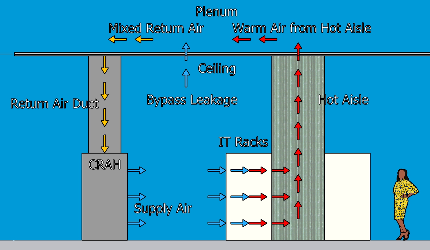 Hot Aisle Containment (HAC) is a popular strategy where cold air is supplied to the room and passed through the IT equipment before returning to the CRAH. Ideally, the air supplied by the CRAH is in balance with the air demanded by the IT equipment so that conditioned air passes once through the racks. In the real world, some amount of air bypasses the IT equipment or recirculates through due to leakage in containment structures. The result is elevated fan power and reduced chiller efficiency.